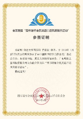 获奖证书 该活动于2019 年4月1日正式开始,网络初选历时40天,全国共1317 所图书馆参与组织,共有171778 名选手报名参加。经过“网络初选”“网络复选”,晋级“全国总展示”环节的选手约300余名。曾佳俊同学在初选中获得第一名,在“网络复选”环节更是以前十名的优异成绩成功晋级“全国总展示”,获得“英语口语金星(一星)”。