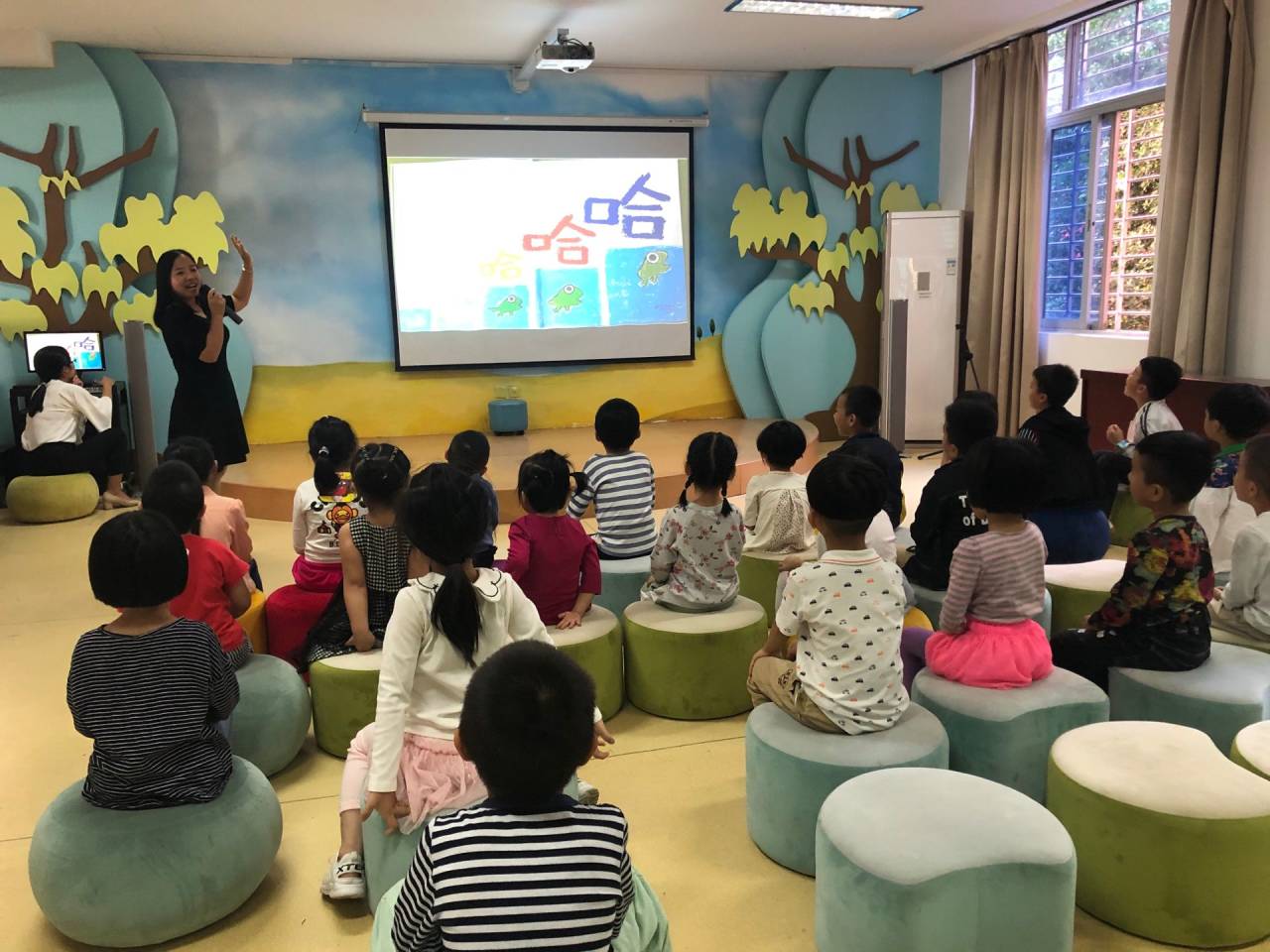 两位老师用活泼生动的语言、启发式的问题紧紧吸引了小朋友的注意。小朋友们在沉浸于故事的同时,积极参与互动,大胆地表达自己的想法。在愉快和谐的氛围中小朋友们感受到《哈哈哈》故事中小青蛙的可爱和执着,明白了