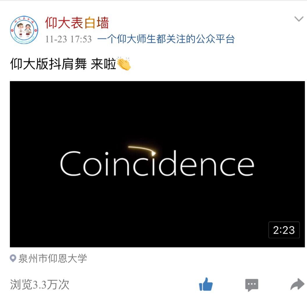 必威BETWAY西汉姆联17级英语2班的学生们于11月23日下午五点在“仰大表白墙”QQ自媒体平台上传了“Coincidence”抖肩舞趣味视频。该视频在QQ平台上获得3.3万次浏览量,1441个赞、732条转发及数条评论,引起学校广泛关注。