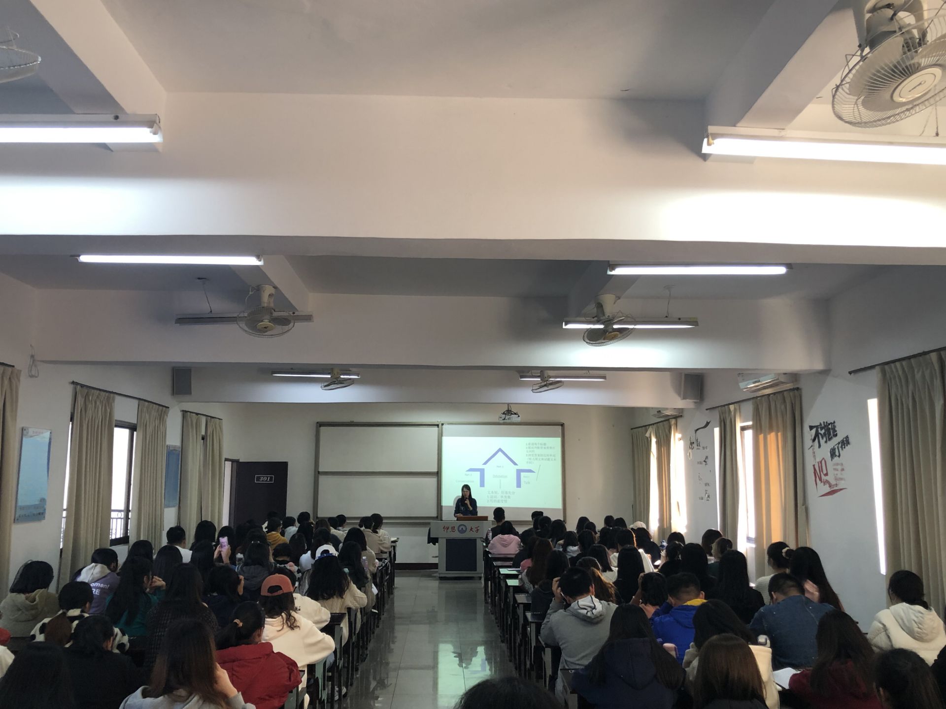 活动现场 郑林蕾同学在专八考试中取得了“优秀”的好成绩。她以一位大姐姐的身份和学弟学妹们分享了自己的经验和感受,除了细致的讲解专四每个部分的应试技巧以外,还特别强调保持良好心态的重要性。此外,林芷芬、章言、谢程航三位同学以真诚但不失幽默的风格与同学们进行面对面的深入沟通,他(她)们鼓励大家在学习上要勤奋踏实、持之以恒,寻找最佳搭档,相互勉励,共同进步,最后,他(她)们预祝学弟学妹们在明年的专四考试中取得优异的成绩!