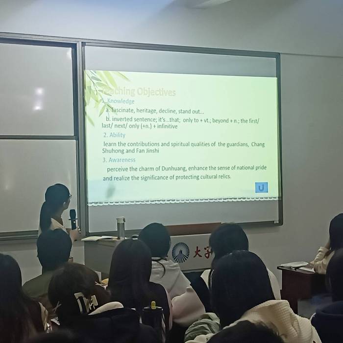 11月27日下午,李媛媛老师主讲了大学英语1观摩示范课,内容为《敦煌守护者》。李媛媛老师以饱满的精神状态,通过问题导入和互动提问,有效提升了学生对敦煌文化及其守护者精神的理解。示范课结束后,全体教师进行了热烈的研讨,三位院级督导老师提出了关于PPT设计和教学环节安排的中肯建议。其他教师也积极参与讨论,分享教学经验,为今后的教学工作积累了宝贵经验。