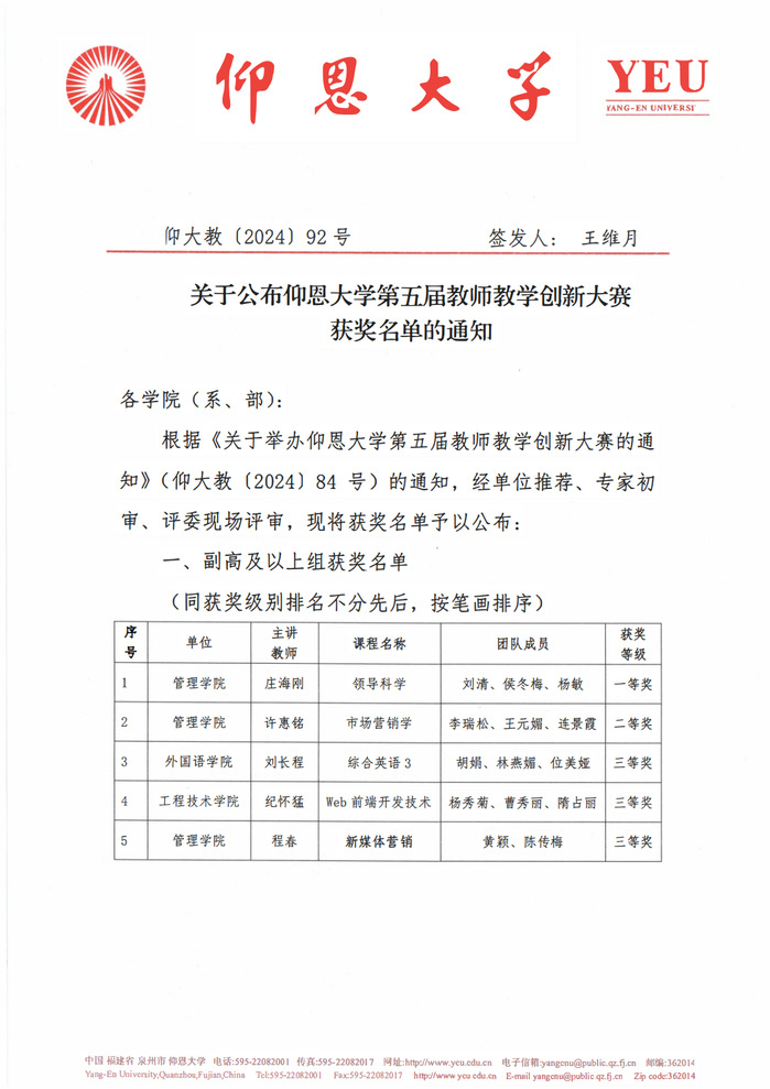 近日,仰恩大学第五届教师教学创新大赛落下帷幕,必威BETWAY西汉姆联的肖婵婵和刘长程两位教师在比赛中表现出色,分别荣获中级及以下组一等奖和副高及以上组三等奖。