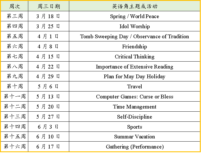 每周三的英语角主题如下: